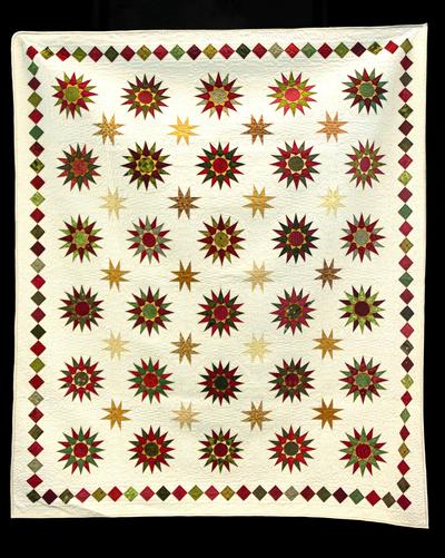 Red and Green Mariner's Compass blocks on white background with Gold stars in sashing. Custom quilted with piped binding. Made by master quilter Phyllis Pokorny.