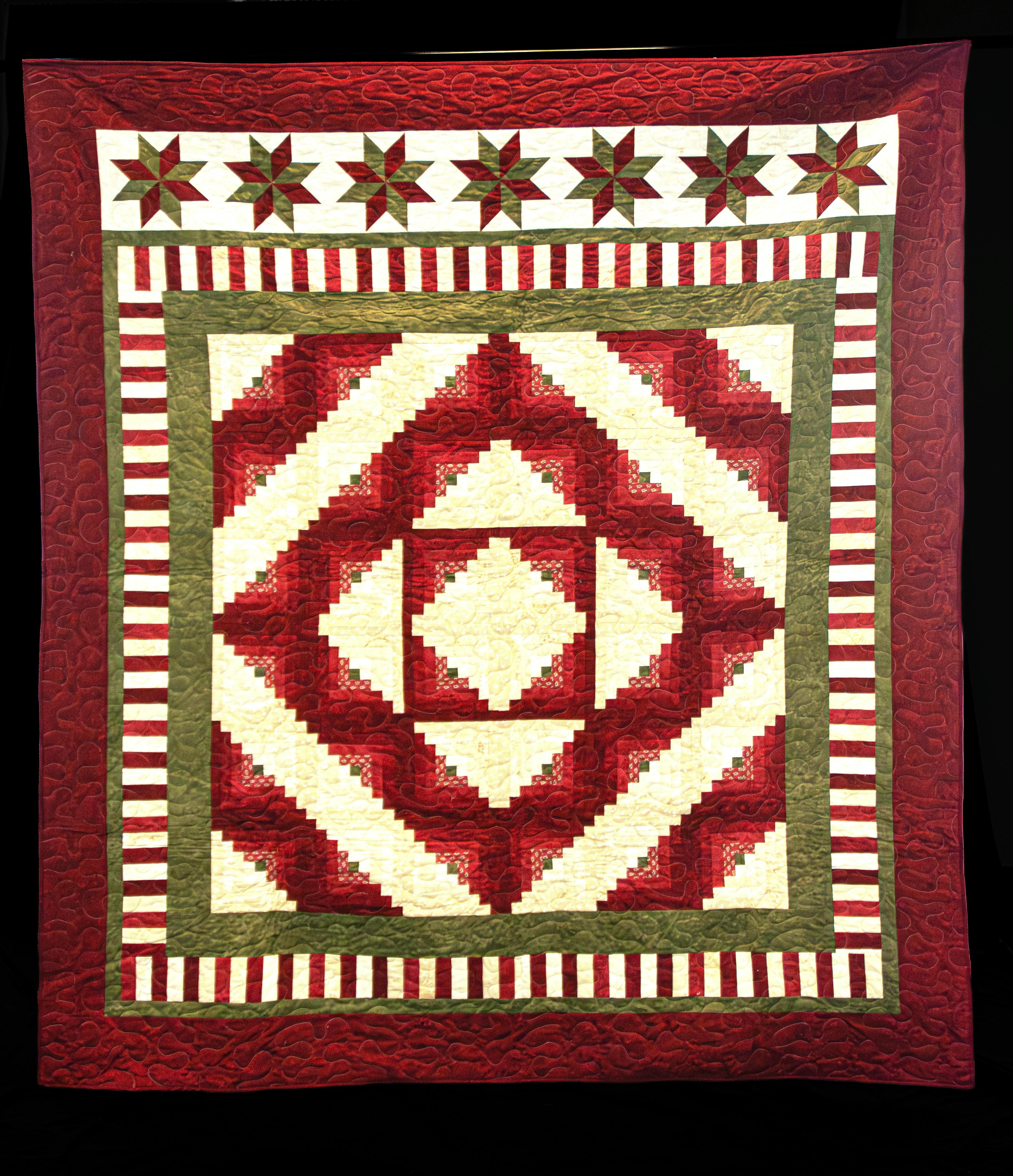 LeMoyne Stars over log cabin blocks in green, shades of dark reds and shades of off whites. Pieced by Mindy Smith and quilted by Mike Smith.